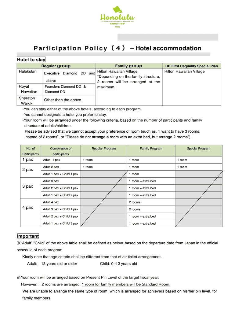 P an r t i c i pa t i o n P o l i c y Hotel accommodation Hotel to stay Regular group HalekulaniRoyal Hawaiian Sheraton WaikikiFamily group Hilton Hawaiian Village Executive Diamond DD and *Depending