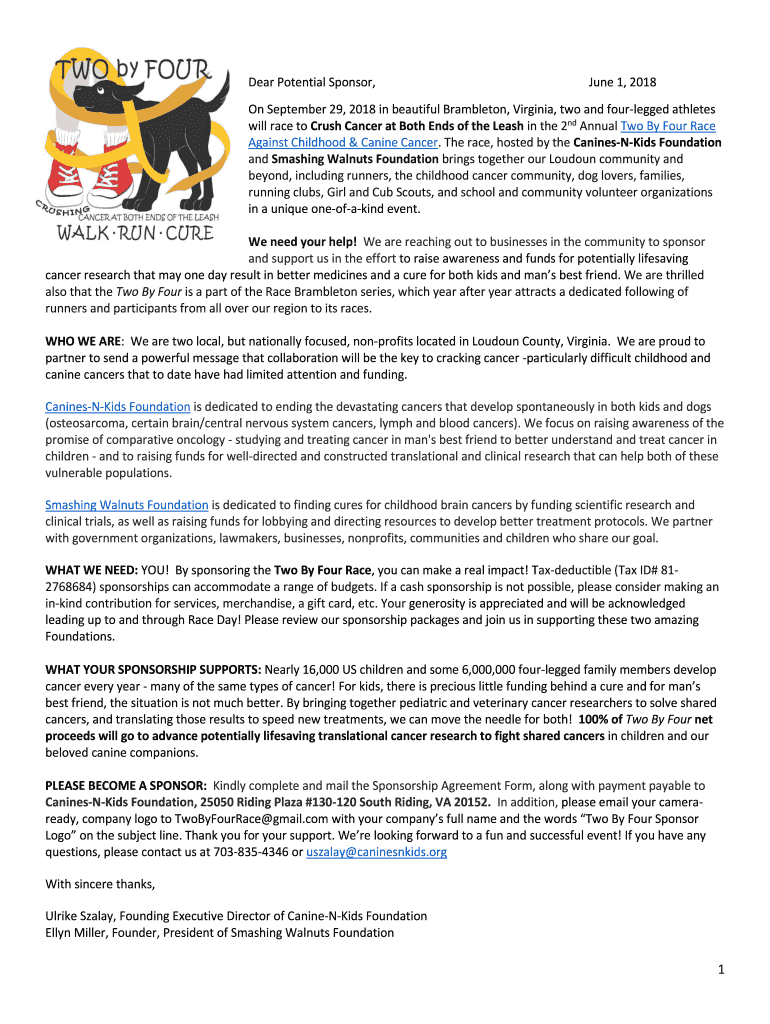 Dear Potential Sponsor, June 1, 2018On September 29, 2018, in beautiful Bramble ton, Virginia, two and four legged athletes will race to Crush Cancer at Both Ends of the Leash in the 2nd Annual Two