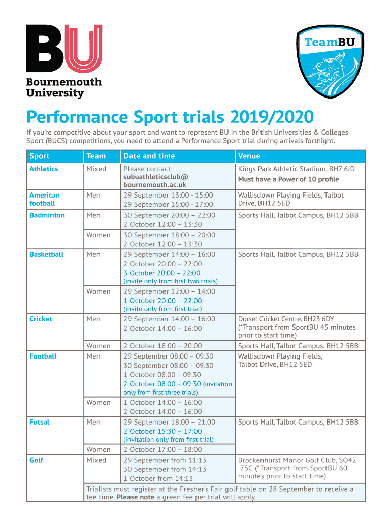 TeamBUPerformance Sport trials 2019/2020If you're competitive about your sport and want to represent BU in the British Universities & Colleges Sport (BUS) competitions, you need to attend a Performance