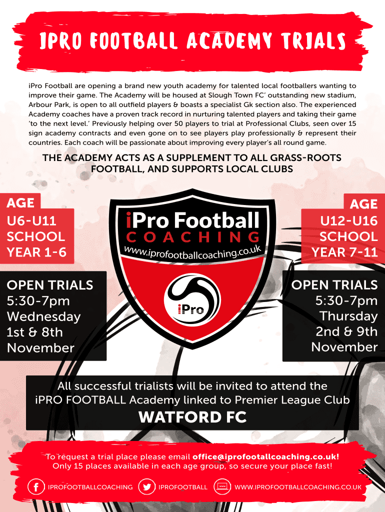 PRO FOOTBALL ACADEMY TRIALS pro Football are opening a brand-new youth academy for talented local footballers wanting to improve their game. The Academy will be housed at Slough Town FC outstanding