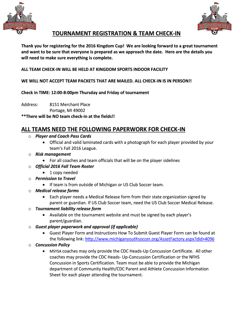 TOURNAMENT REGISTRATION & TEAM CHECKING Thank you for registering for the 2016 Kingdom Cup! We are looking forward to a great tournament and want to be sure that everyone is prepared as we approach