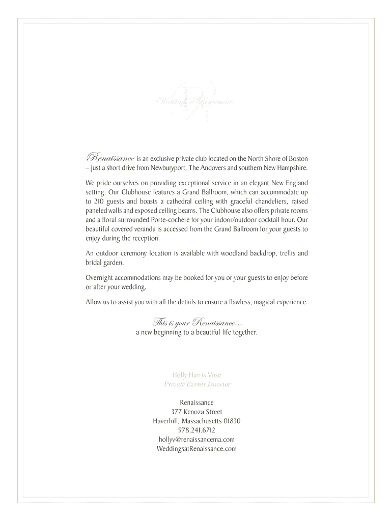 Weddings at Renaissance is an exclusive private club located on the North Shore of Boston just a short drive from Newburyport, The Handovers and southern New Hampshire. We pride ourselves on providing