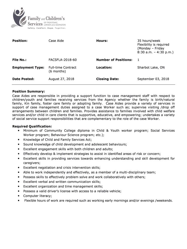 Position:Case Hideous:35 hours/week Flexibility is required (Monday Friday 8:30 a.m. 4:30 p.m.) File No.:FACSFLA201860Number of Positions:1Employment Type:Full time Contract (6 months)Location:Harbor
