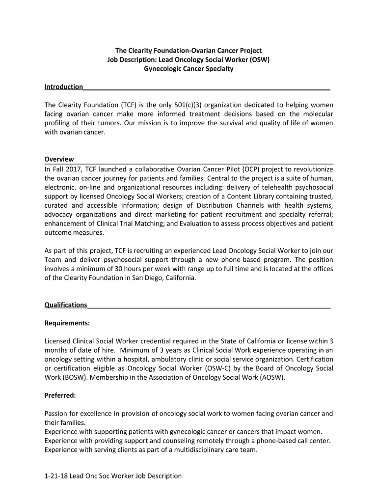 The Clarity FoundationOvarian Cancer Project Job Description: Lead Oncology Social Worker (NSW) Gynecologic Cancer Specialty Introduction The Clarity Foundation (TCF) is the only 501(c)(3) organization
