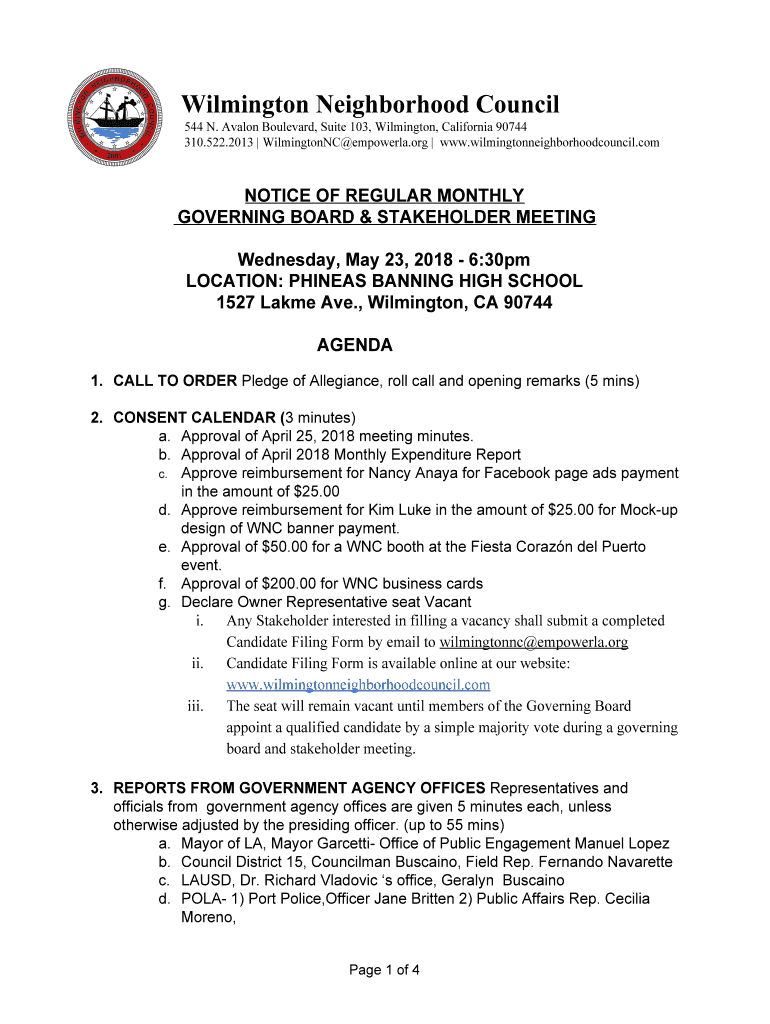 Wilmington Neighborhood Council 544 N. Avalon Boulevard, Suite 103, Wilmington, California 90744 310.522.2013 Wilmington NC empower la.org www.wilmingtonneighborhoodcouncil.comNOTICE OF REGULAR MONTHLY
