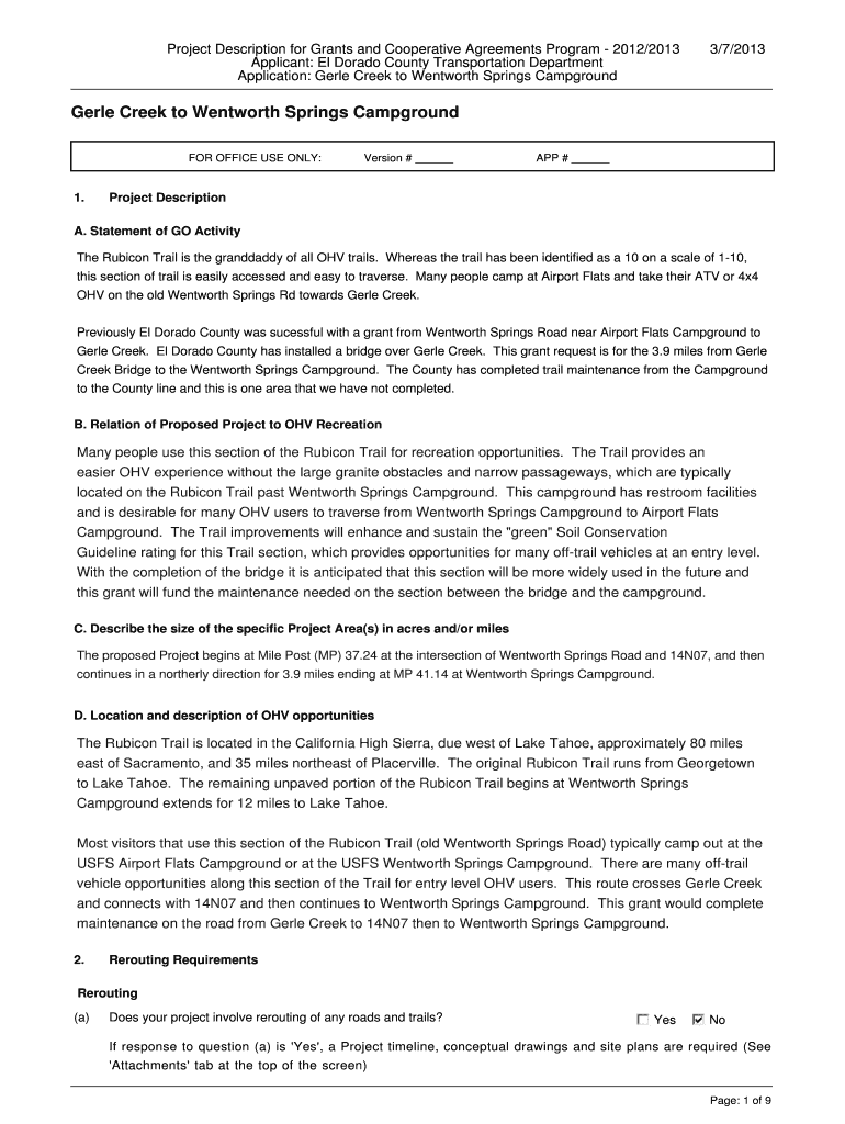 Project Description for Grants and Cooperative Agreements Program 2012/2013 3/7/2013 Applicant: El Dorado County Transportation Department Application: Merle Creek to Wentworth Springs Campground