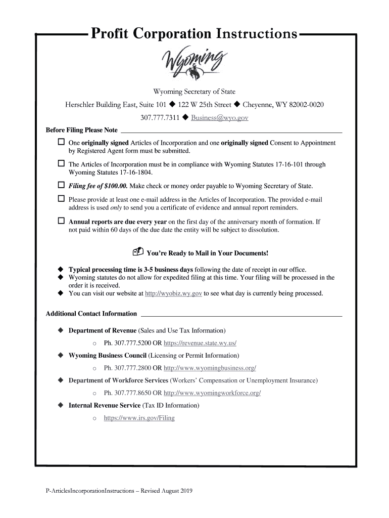 Profit Corporation Instructions Wyoming Secretary of State Herschel Building East, Suite 101 122 W 25th Street Cheyenne, WY 820020020 307.777.7311 Business Wyo.gov Before Filing Please Note One originally