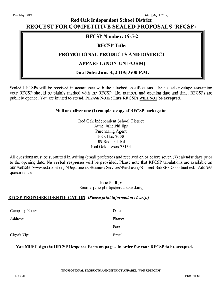 Rev. May 2019Date: May 8, 2019, Red Oak Independent School DistrictREQUEST FOR COMPETITIVE SEALED PROPOSALS (RFCs) RFCs Number: 1952 RFCs Title: PROMOTIONAL PRODUCTS AND DISTRICT APPAREL (NONUNIFORM)