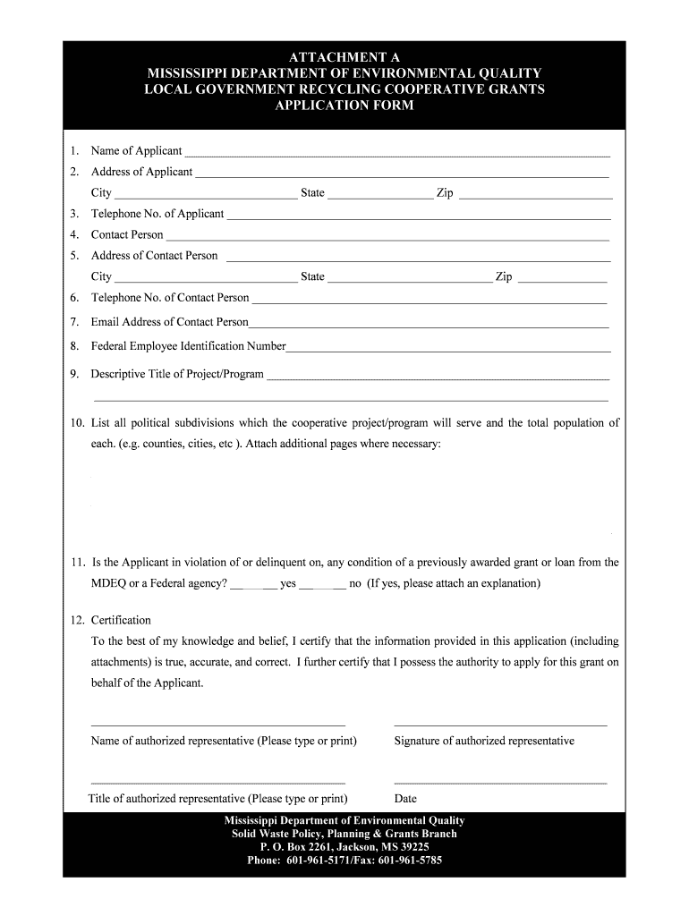 ATTACHMENT A MISSISSIPPI DEPARTMENT OF ENVIRONMENTAL QUALITY LOCAL GOVERNMENT RECYCLING COOPERATIVE GRANTS APPLICATION FORM 1. Name of Applicant 2. Address of Applicant City State Zip 3. Telephone