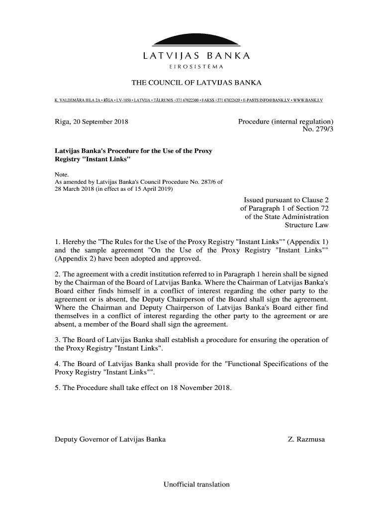 THE COUNCIL OF LATVIA BANK K. CALDERA BELA 2A RGA LV1050 LATVIA TLR UNIS +371 67022300 FAKES +371 67022420 PASTS INFO BANK.LV WWW.BANK. Riga, 20 September 2018Procedure (internal regulation) No. 279/3Latvijas