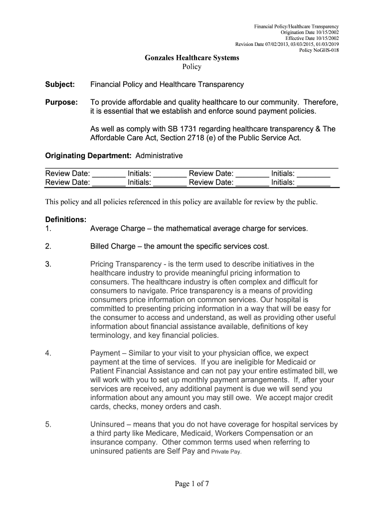 Financial Policy/Healthcare Transparency Origination Date 10/15/2002 Effective Date 10/15/2002 Revision Date 07/02/2013, 03/03/2015, 01/03/2019 Policy NoGHS018Gonzales Healthcare Systems Policy Subject:Financial