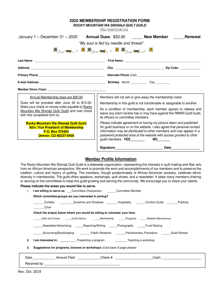 2020 MEMBERSHIP REGISTRATION FORM ROCKY MOUNTAIN WA SHINJI QUILT GUILD http://washonaji.orgJanuary 1 December 31 2020Annual Dues: $30.00 New Member Renewal soul is fed by needle and threadiest Name: