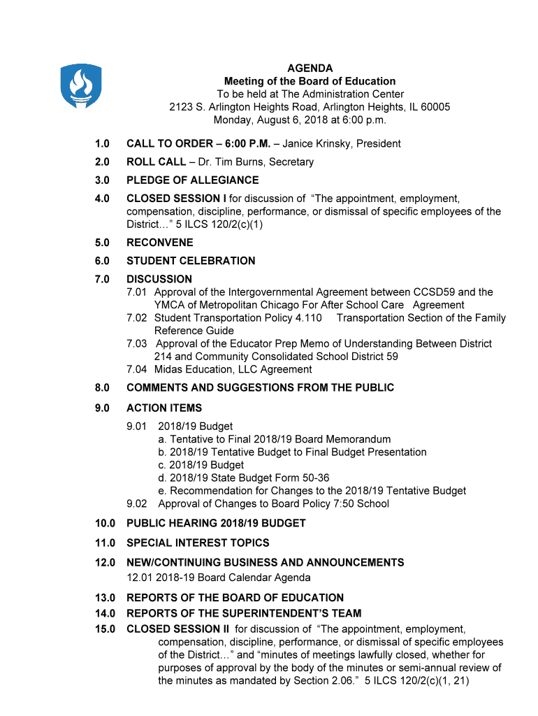 AGENDA Meeting of the Board of Education To be held at The Administration Center 2123 S. Arlington Heights Road, Arlington Heights, IL 60005 Monday, August 6, 2018, at 6:00 p.m. 1.0CALL TO ORDER 6:00