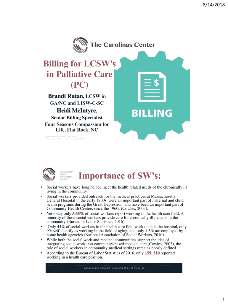 8/14/2018Billing for LCSW in Palliative Care (PC) Brandi Rutan, LCSW in GA/NC and LISTS Heidi McIntyre, Senior Billing Specialist Four Seasons Compassion for Life, Flat Rock, NC Innovation and Excellence