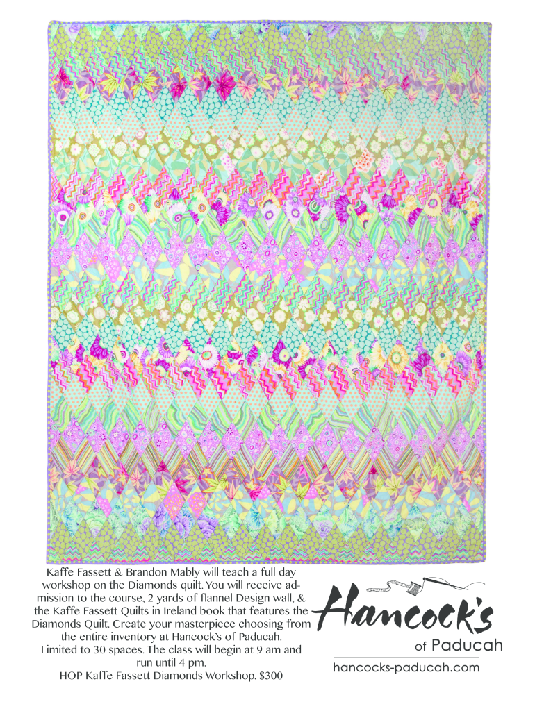 Gaffe Bassett & Brandon Madly will teach a full day workshop on the Diamonds quilt. You will receive admission to the course, 2 yards of flannel Design wall, & the Gaffe Bassett Quilts in Ireland