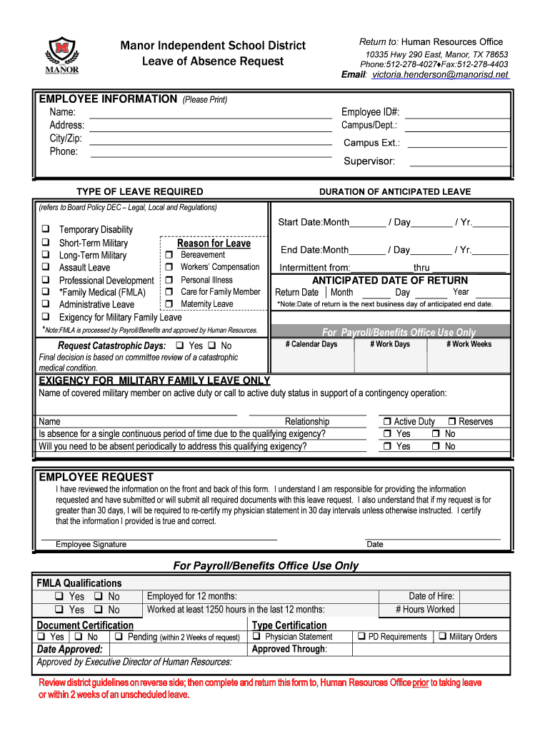 Return to: Human Resources OfficeMax Independent School District Leave of Absence Request10335 Hwy 290 East, Manor, TX 78653 Phone:5122784027Fax:5122784403Email: Victoria. Henderson's manors. Employee