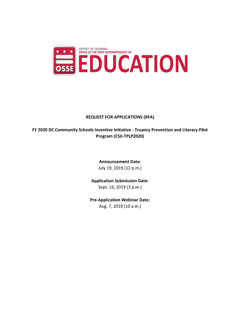 REQUEST FOR APPLICATIONS (RFA) FY 2020 DC Community Schools Incentive Initiative Truancy Prevention and Literacy Pilot Program (CSIITPLP2020)Announcement Date: July 19, 2019:12 p.m.) Application Submission