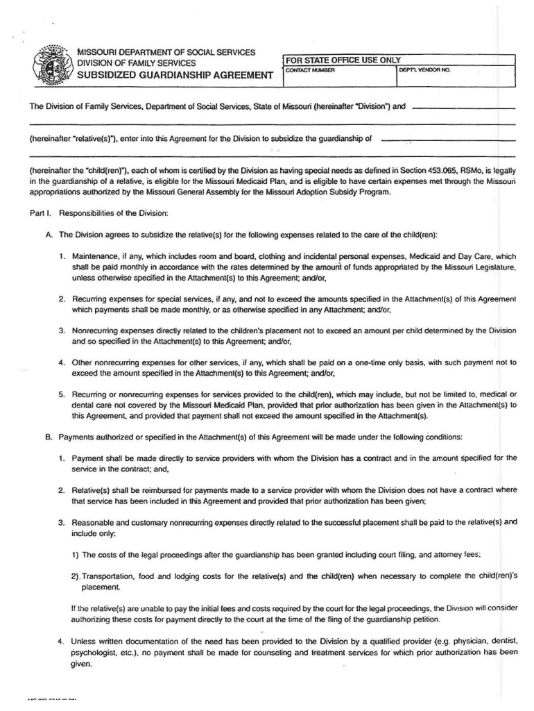 RESET ::::.MISSOURI DEPARTMENT OF SOCIAL SERVICESDIVISION OF FAMILY SERVICESSUBSIDIZED GUARDIANSHIP AGREEMENTlFOR STATE FACE USE ONLY kept. VENDOR NO. The Division of Family Services, Department of