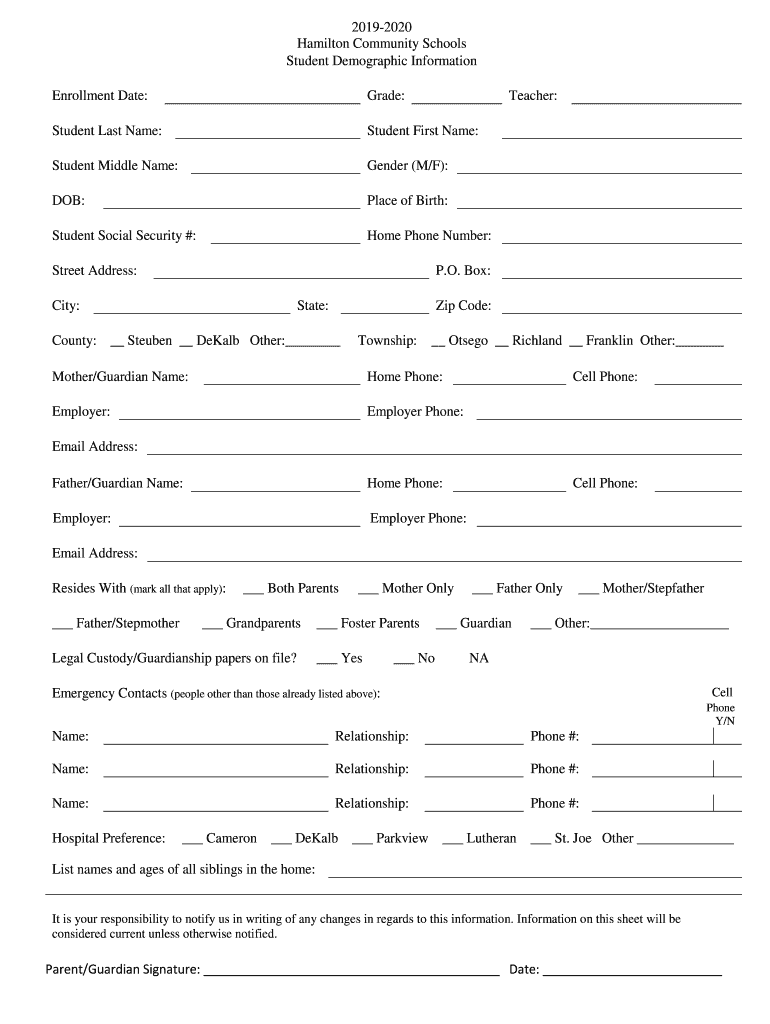 20192020 Hamilton Community Schools Student Demographic Information Enrollment Date:Grade:Teacher:Student Last Name:Student First Name:Student Middle Name:Gender (M/F):DOB:Place of Birth:Student Social