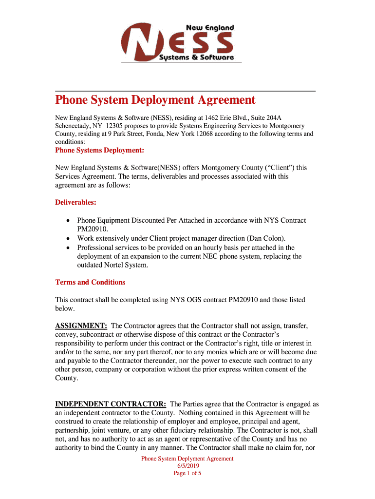 Phone System Deployment Agreement New England Systems & Software (LESS), residing at 1462 Erie Blvd., Suite 204A Schenectady, NY 12305 proposes to provide Systems Engineering Services to Montgomery