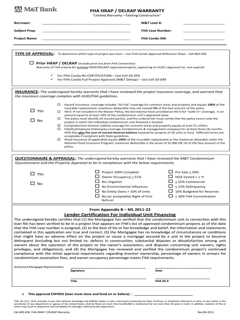 FHA RAP / DEL RAP WARRANTY Limited Warranty Existing Construction Borrower: M&T Loan #: Subject Prop: FHA Case Number: Project Name: FHA Condo ID#: TYPE OF APPROVAL:To determine which type of project