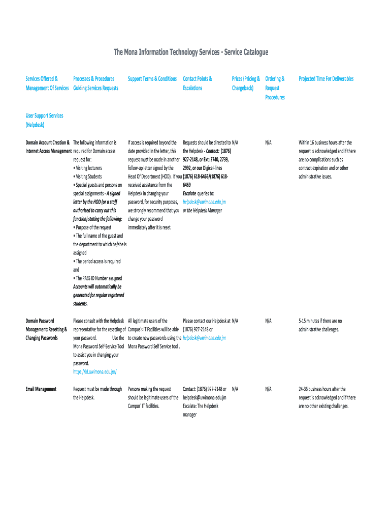 The Mona Information Technology Services Service Catalog Services Offered & Management Of ServicesProcesses & Procedures Guiding Services RequestsSupport Terms & ConditionsContact Points & EscalationsPrices