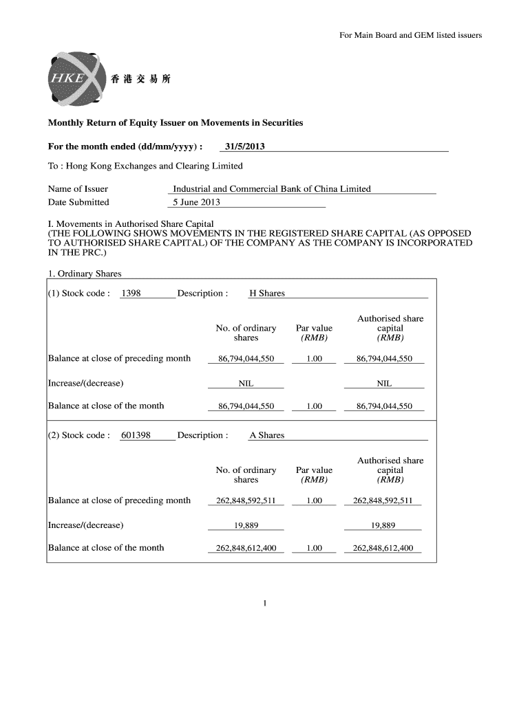 For the month ended (dd/mm/YYY) :31/5/2013To : Hong Kong Exchanges and Clearing Limited