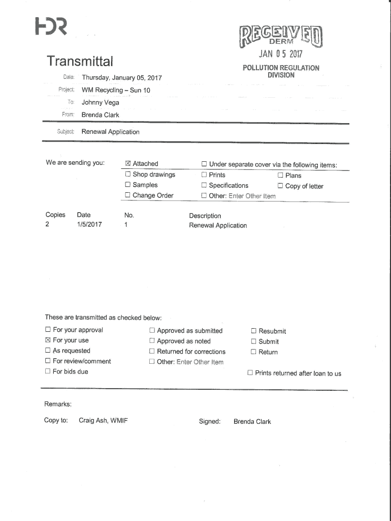Transmittal Date: Project:Thursday, January 05, 2017, WM Recycling Sun 10To:Johnny Veganism:Brenda ClarkSubject:Renewal Application are sending you:Copies 2Date 1/5/2017 Attached Under separate cover