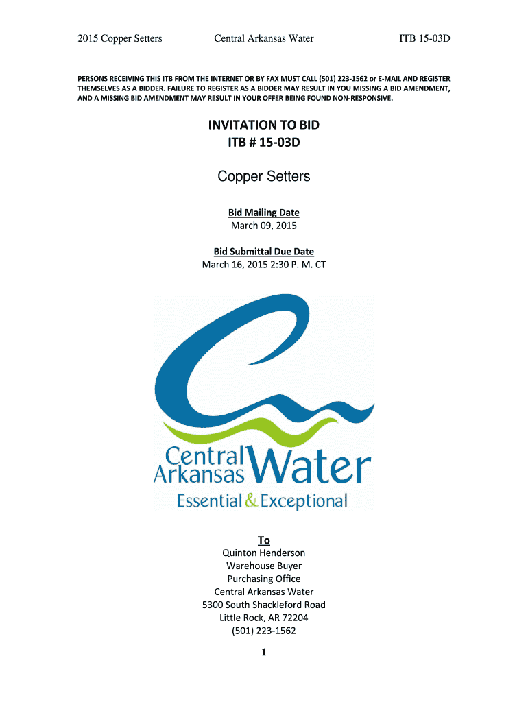 2015 Copper Setters Central Arkansas Water ITB 1503D PERSONSRECEIVINGTHISITBFROMTHEINTERNETORBYFAXMUSTCALL(501)2231562orEMAILANDREGISTER THEMSELVESASABIDDER.FAILURETOREGISTERASABIDDERMAYRESULTINYOUMISSINGABIDAMENDMENT,