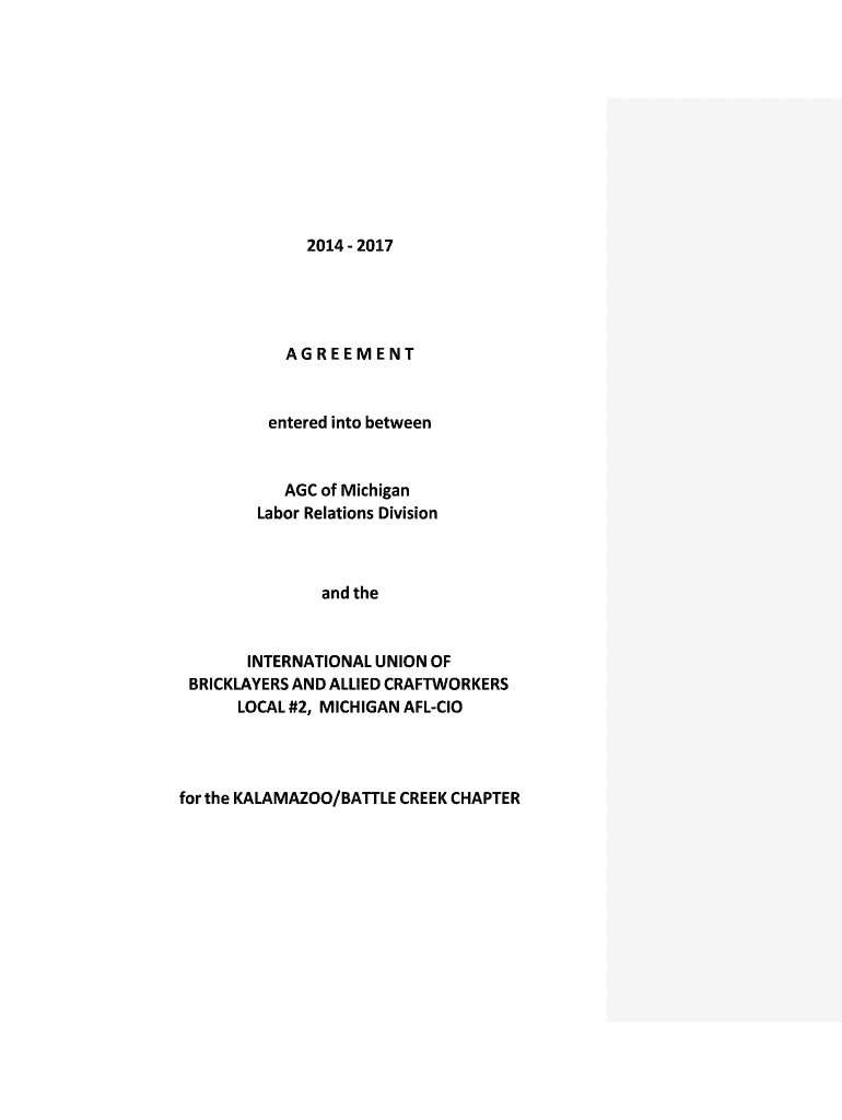 2014 2017AGREEMENTentered into between AGC of Michigan Labor Relations Division and international UNION OF BRICKLAYERS AND ALLIED CRAFTWORKERS LOCAL #2, MICHIGAN Alcindor the KALAMAZOO/BATTLE CREEK