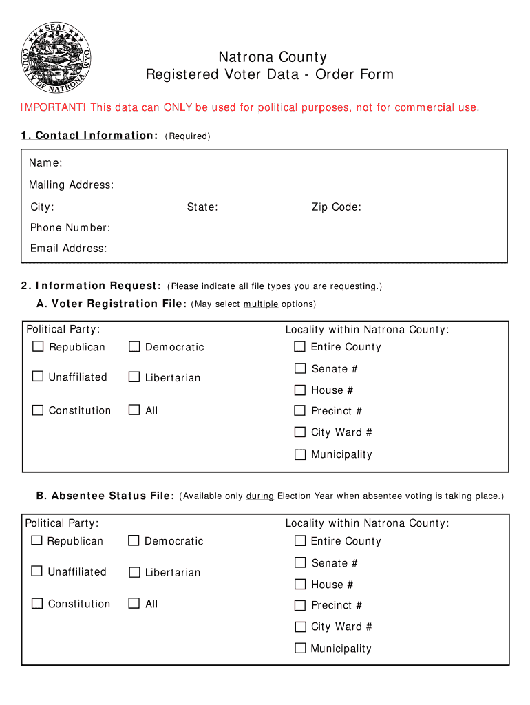 Natron County Registered Voter Data Order Form IMPORTANT! This data can ONLY be used for political purposes, not for commercial use. 1. Contact Information: (Required) Name: Mailing Address: State:City:Zip