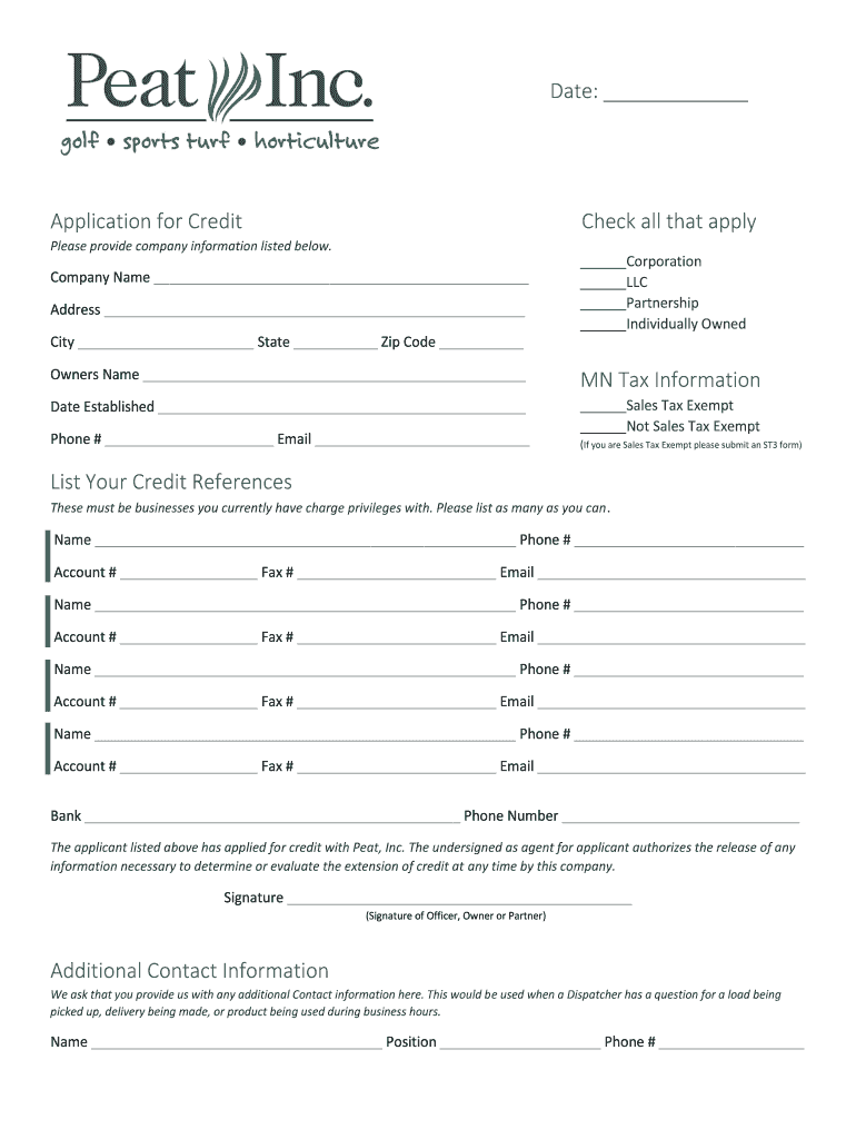 Date: Application for CreditCheck all that applyPlease provide company information listed below. Company Name Address Corporation LLC Partnership Individually OwnedCity State Zip Code Owners Name