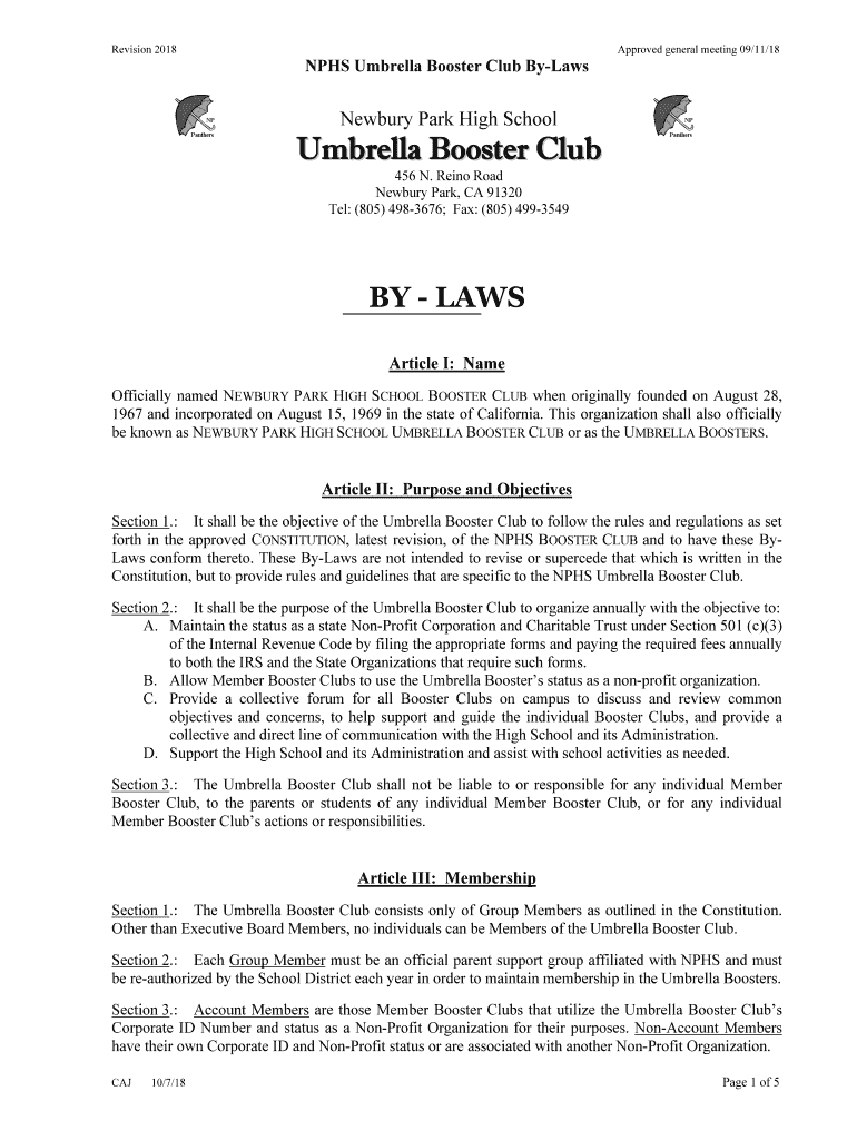 Revision 2018Approved general meeting 09/11/18NPHS Umbrella Booster Club ByLawsNewbury Park High SchoolUmbrella Booster Club 456 N. Ran Road Newbury Park, CA 91320 Tel: (805) 4983676; Fax: (805) 4993549BY