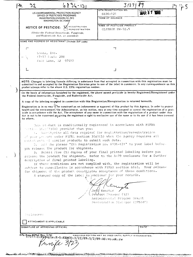3 (27 J K '; EPA REGISTRATION NO.environmental PROTECTION AGENCY OFFICE OF PESTICIDES PROGRAMS REGISTRATION DMS ION (TS767/ WASHINGTON, DC 20461NOTICE OF PESTICIDE’d n ':L 'limit IS.NAME OF PESTICIDE
