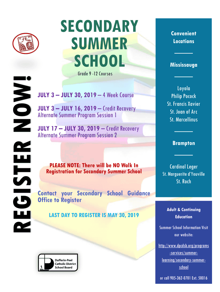 REGISTER NOW!SECONDARY SUMMER SCHOOL Grade 9 12 CoursesJULY 3 JULY 30, 2019 4-Week Course JULY 3 JULY 16, 2019, Credit Recovery Alternate Summer Program Session 1 JULY 17 JULY 30, 2019, Credit Recovery