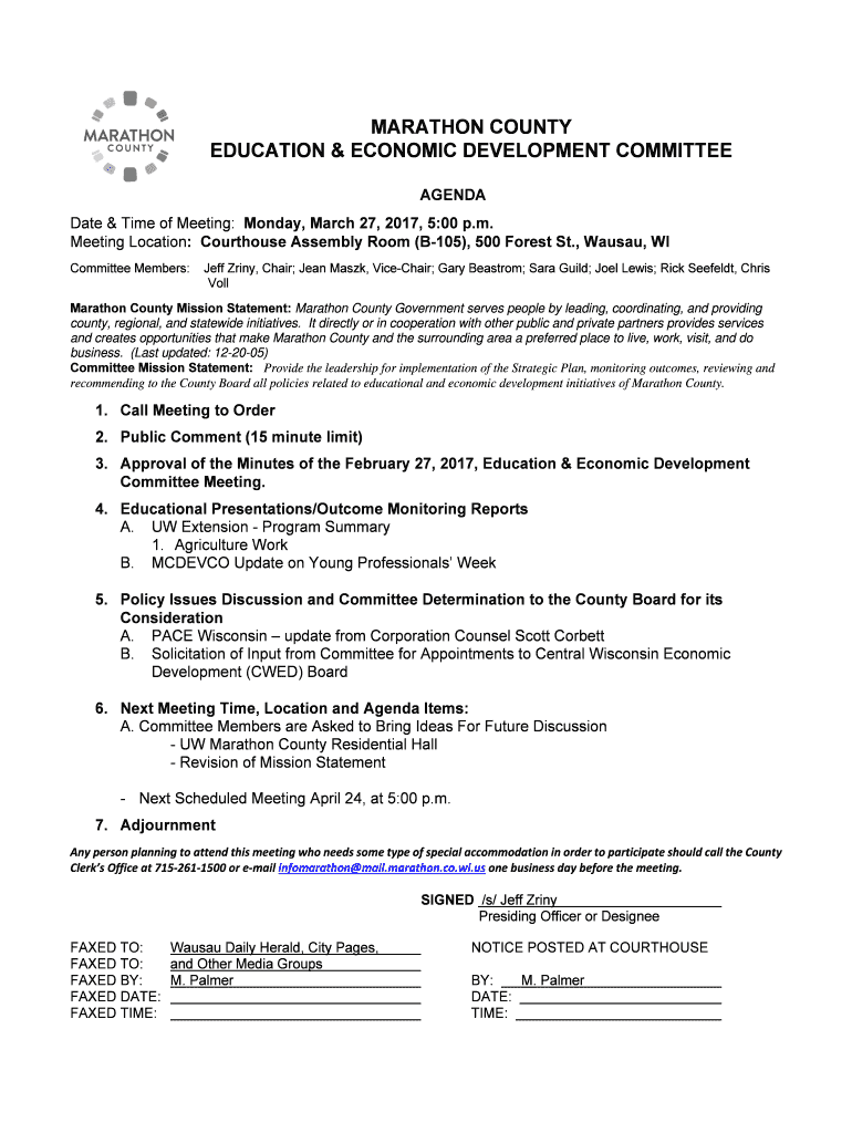 MARATHON COUNTY EDUCATION & ECONOMIC DEVELOPMENT COMMITTEE AGENDA Date & Time of Meeting: Monday, March 27, 2017, 5:00 p.m. Meeting Location: Courthouse Assembly Room (B105), 500 Forest St., Wausau,