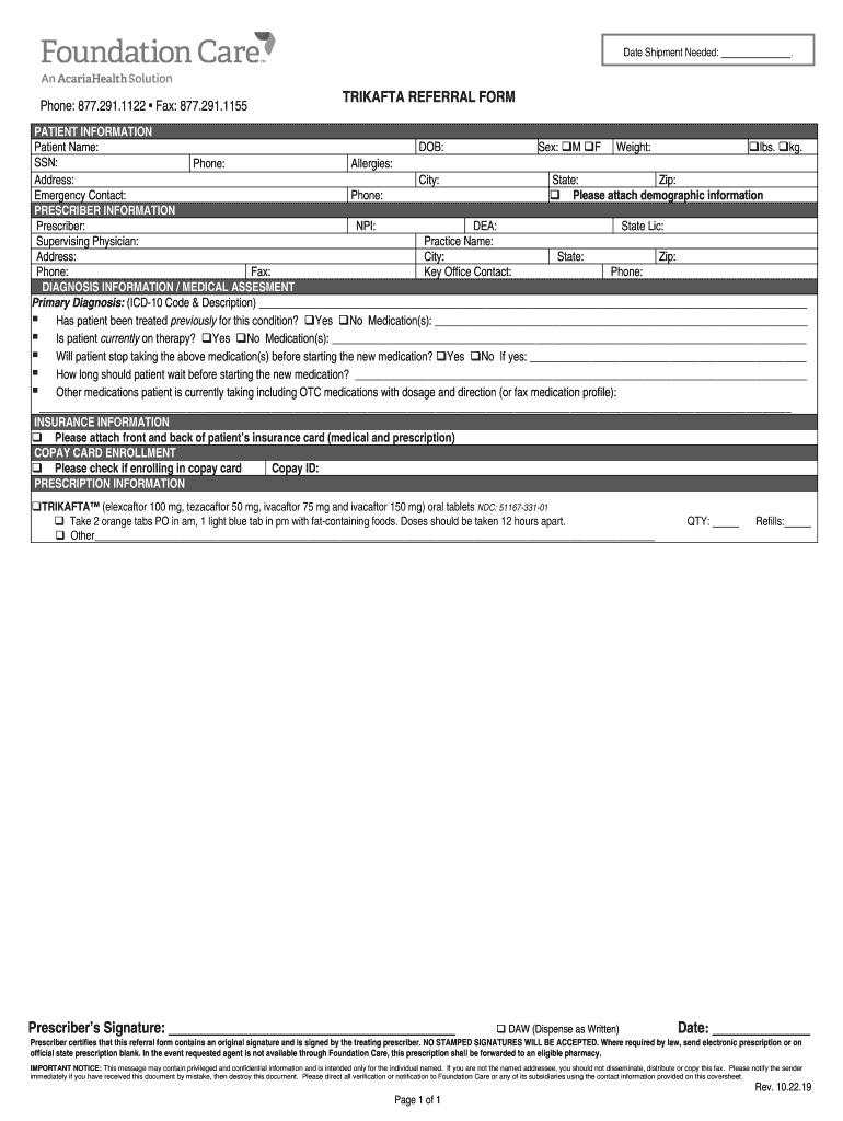 Date Shipment Needed:Phone: 877.291.1122 Fax: 877.291.1155.TAFTA REFERRAL FORMATION INFORMATION Patient Name: DOB: Sex: M F Weight: lbs. kg. SSN: Phone: Allergies: Address: City: State: Zip: Emergency