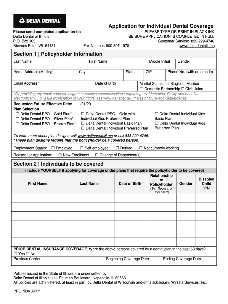 Application for Individual Dental Coverage Please send completed application to: PLEASE TYPE OR PRINT IN BLACK INK Delta Dental of Illinois BE SURE APPLICATION IS COMPLETED IN FULL P.O. Box 103 Customer