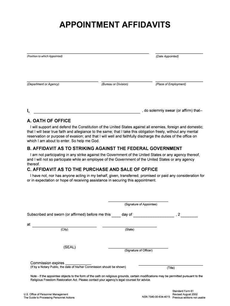 APPOINTMENT AFFIDAVITS(Date Appointed)(Position to which Appointed)(Department or Agency)(Bureau or Division)I, (Place of Employment), do solemnly swear (or affirm) that. OATH OF OFFICE