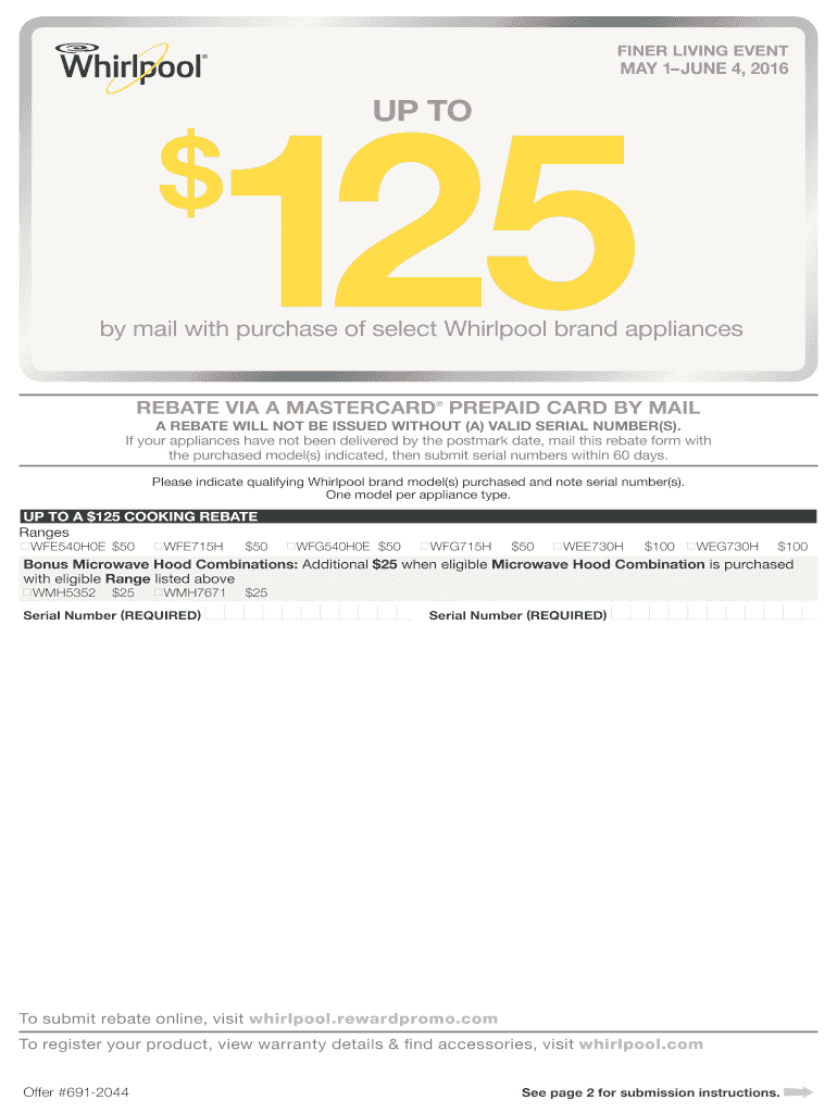 FINER LIVING EVENTUAL 1JUNE 4, 2016125×UP Toby mail with purchase of select Whirlpool brand appliancesREBATE VIA A MASTERCARD PREPAID CARD BY MAIL