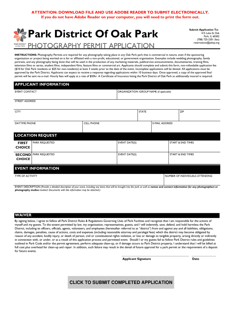 If you do not have Adobe Reader on your computer, you will need to print the form out. Park District Of Oak Presubmit Application