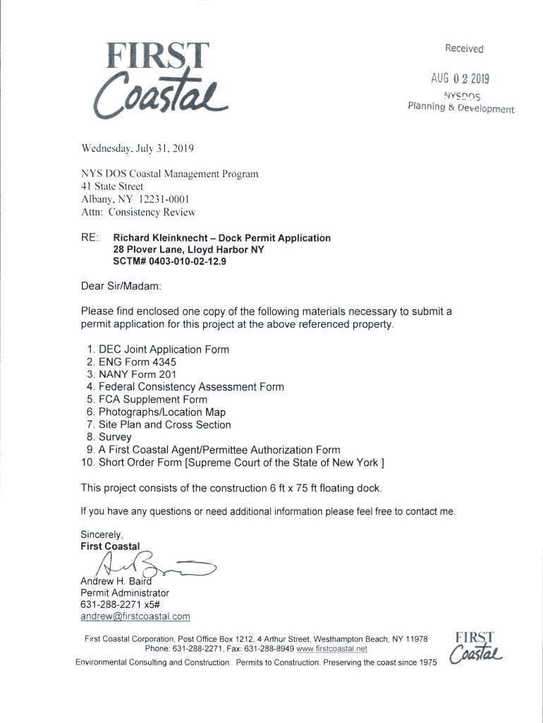 FIRSTReceived(oat rat Wednesday, July3AUG 022019NYSDOSPlanning & Development1,2019NYS DOS Coastal Management Program4l State Street Albany, NY 122310001 Attn: Consistency Review RE:Richard Kleinknecht