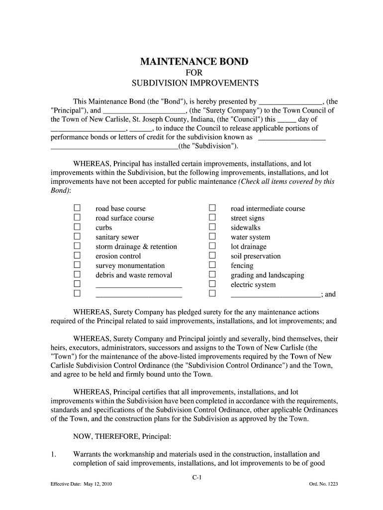 MAINTENANCE BOND FOR SUBDIVISION IMPROVEMENTS This Maintenance Bond (the “Bond “), is hereby presented by, (the “Principal “), and, (the “Surety Company “) to the Town Council of the Town