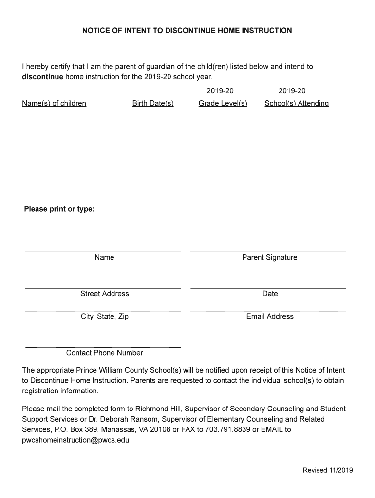 Get the free Notice of Intent to Discontinue Home Instruction August ...