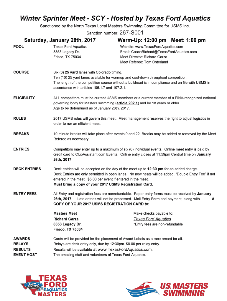 Winter Sprinter Meet SAY Hosted by Texas Ford Aquatics Sanctioned by the North Texas Local Masters Swimming Committee for USES Inc. Sanction number: 2 67S001Saturday, January 28th, 2017WarmUp: 12:00