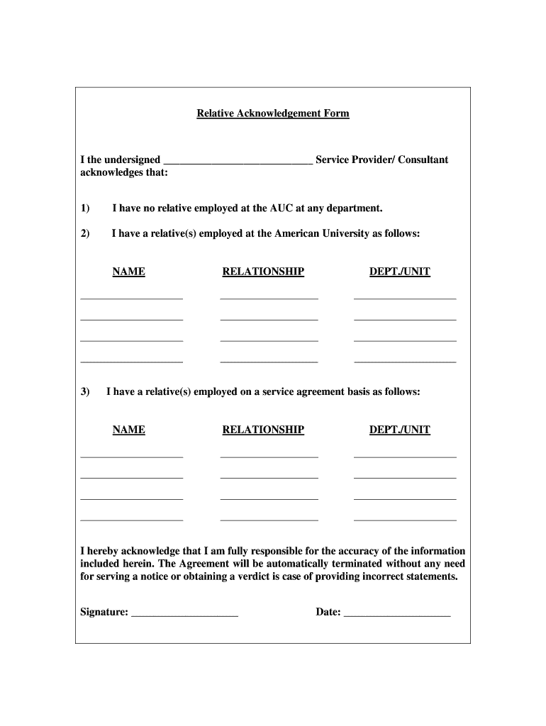 Relative Acknowledgement Form the undersigned Service Provider/ Consultant acknowledges that: 1)I have no relative employed at the AUC at any department.2)I have a relative(s) employed at the American