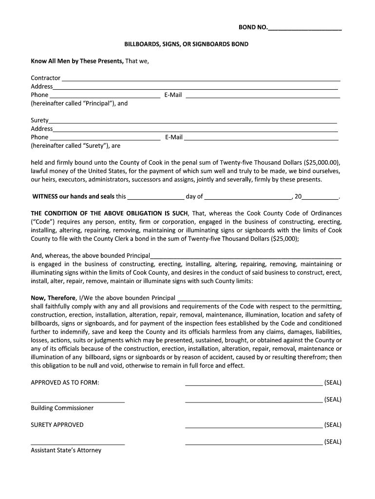 BOND NO. BILLBOARDS, SIGNS, ORSIGNBOARDSBOND KnowAllMenbyThesePresents, That we, Contractor Address Phone Email (hereinaftercalledPrincipal), and Surety Address Phone Email (hereinaftercalledSurety),