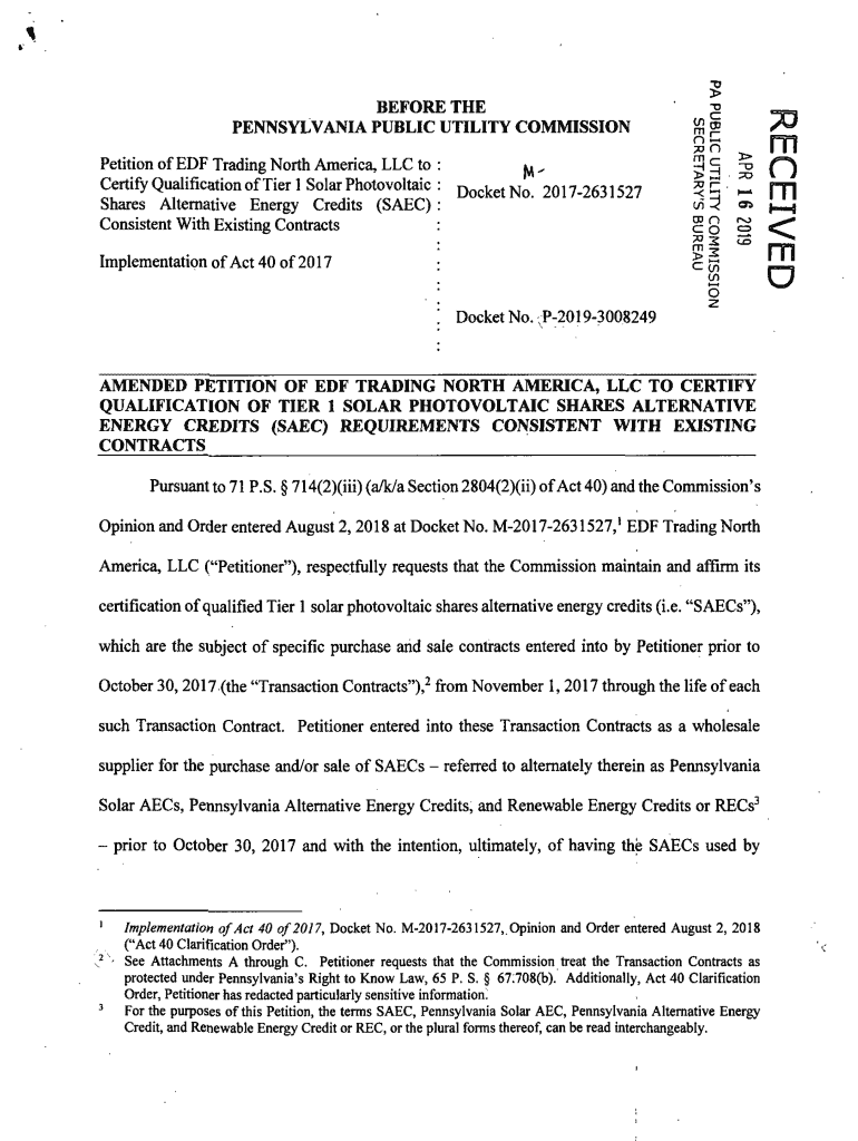 “OC: in m 03 n 70Petition of EOF Trading North America, LLC to Certify Qualification of Tier 1 Solar Photovoltaic Shares Alternative Energy Credits (SAC) Consistent With Existing ContractsDocket