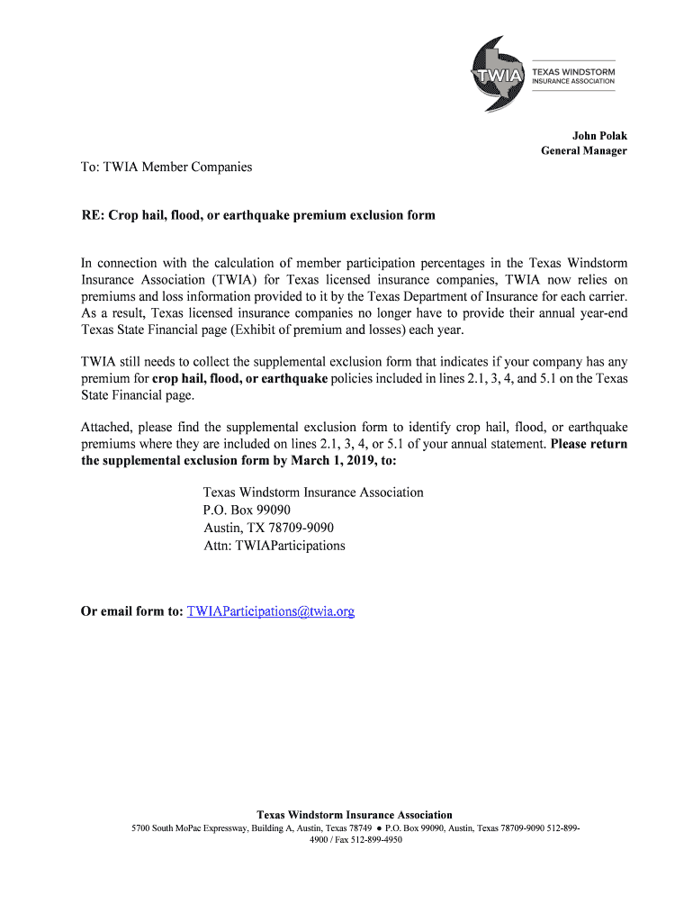 RE: Crop hail, flood, or earthquake premium exclusion forming connection with the calculation of member participation percentages in the Texas Windstorm