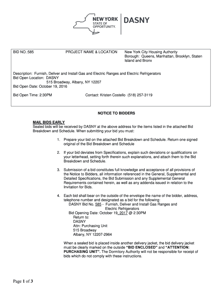 BID NO.:585PROJECT NAME & Location York City Housing Authority Borough: Queens, Manhattan, Brooklyn, Staten Island and BronxDescription: Furnish, Deliver and Install Gas and Electric Ranges and Electric